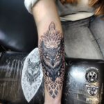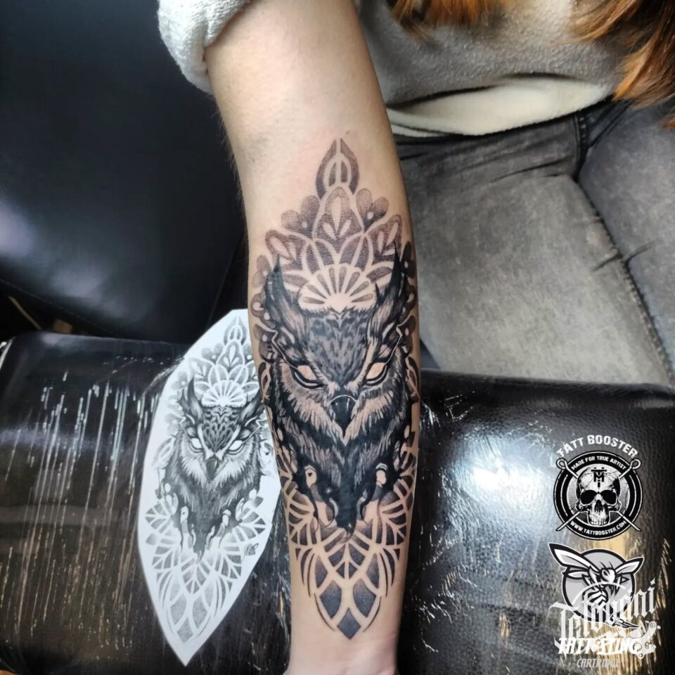 Tetování zvířata, sova a mandala na předloktí