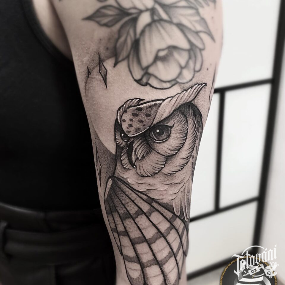 Tetování zvířata, sova na paži