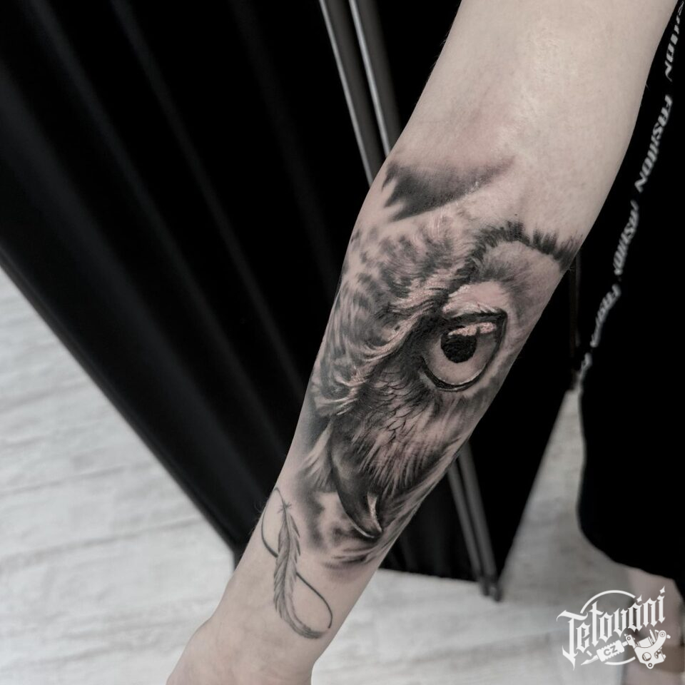 Tetování zvířata, sova, nekonečno, ležatá osmička a pírko na předloktí