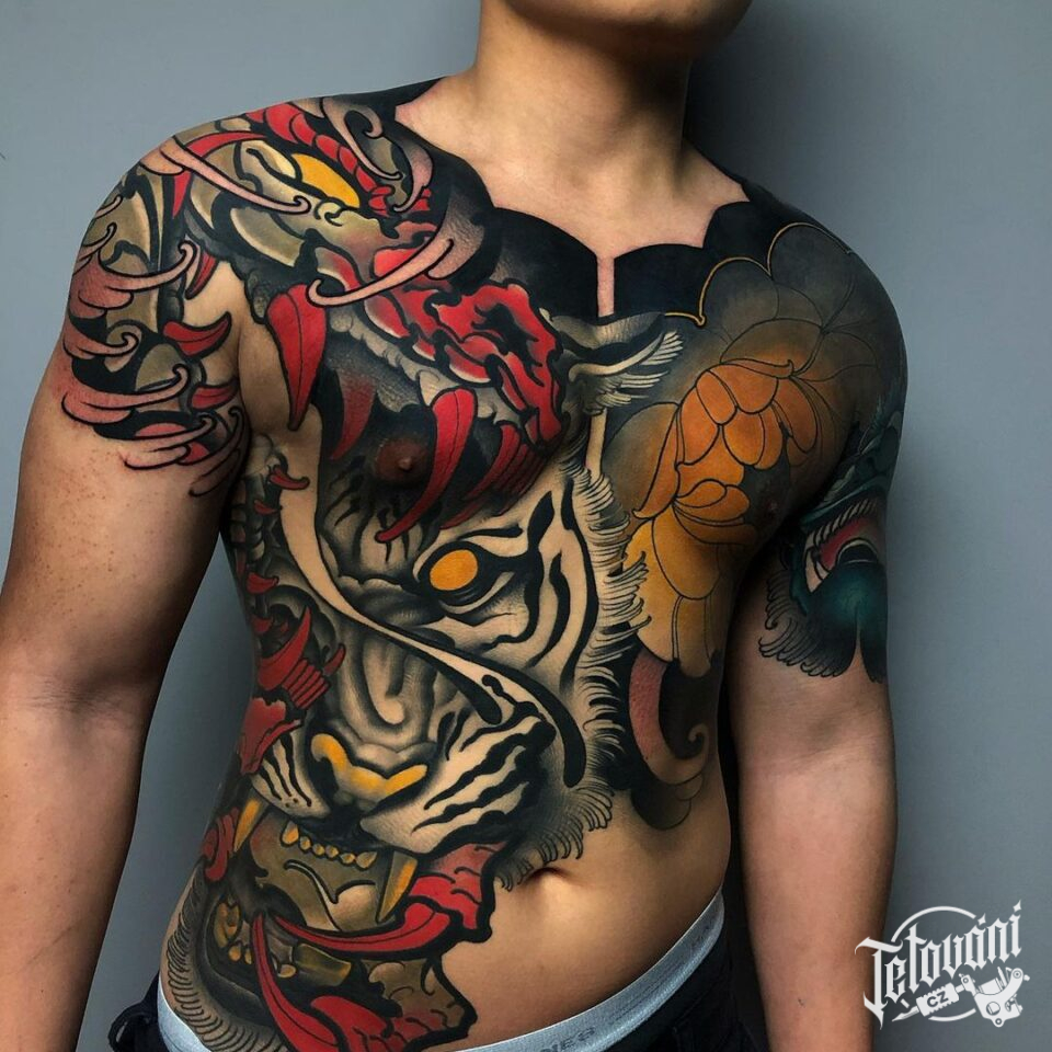 Tetování zvířata, tygr a mýtické bytosti, drak na břiše