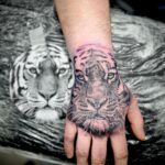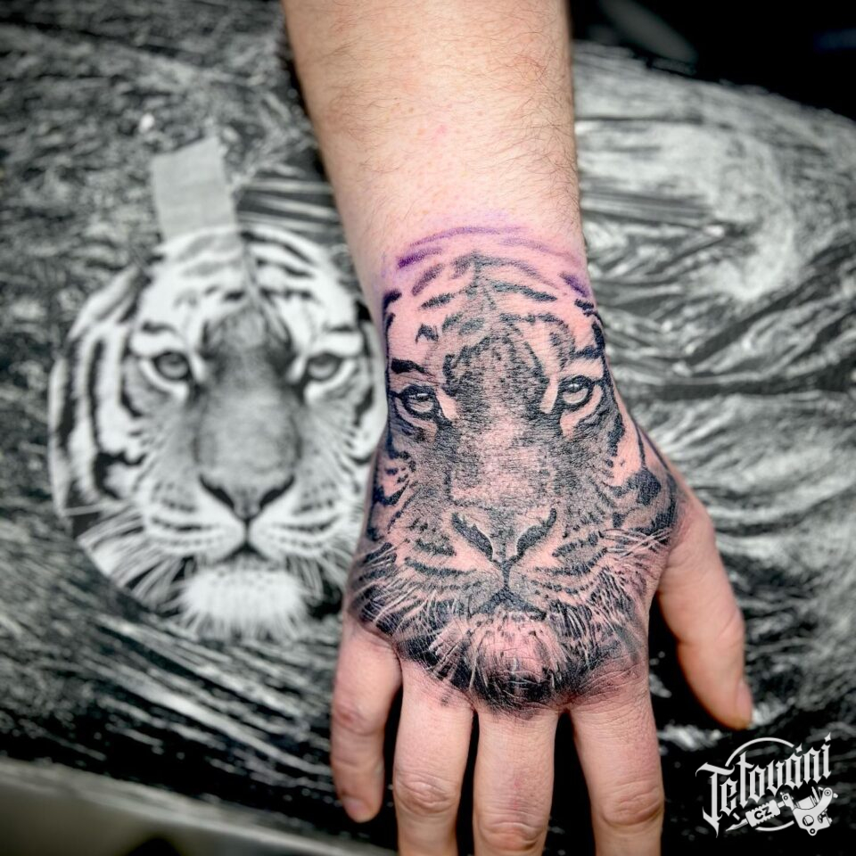 Tetování zvířata, tygr na hřbetu ruky