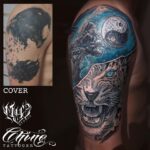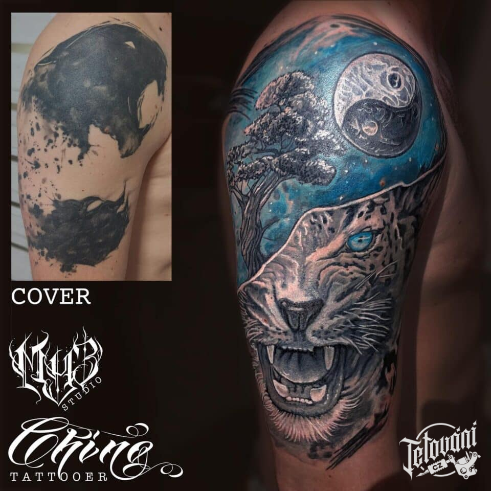 Tetování zvířata, tygr, strom, jin a jang na rameno