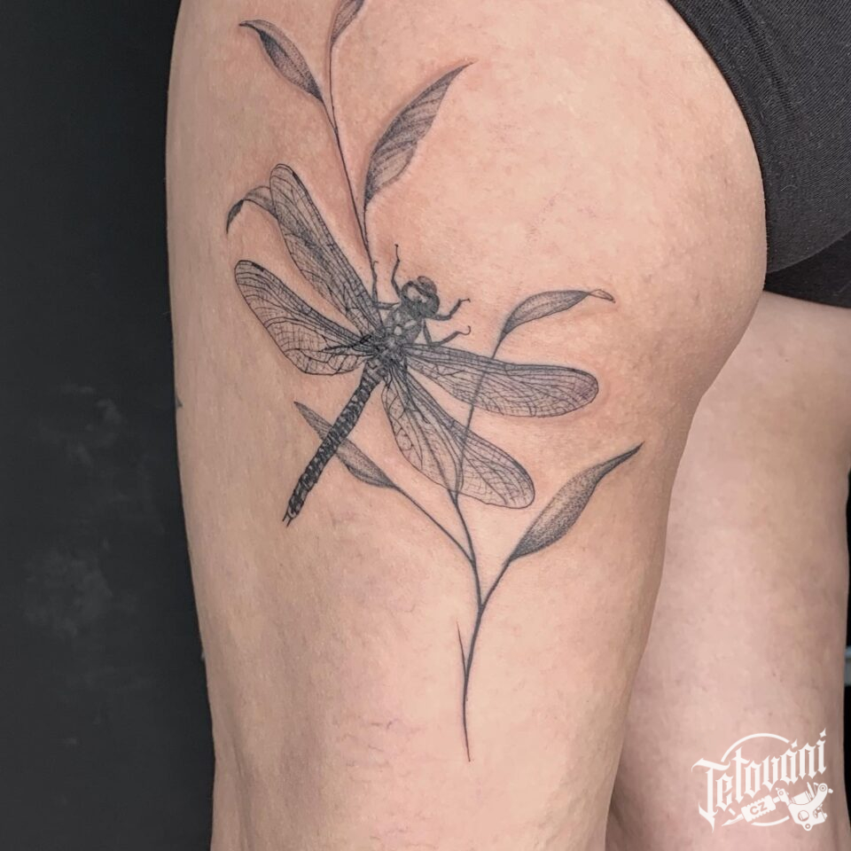 Tetování zvířata, vážka na boku stehna