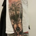 Tetování zvířata, vlk a příroda, hory na předloktí