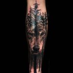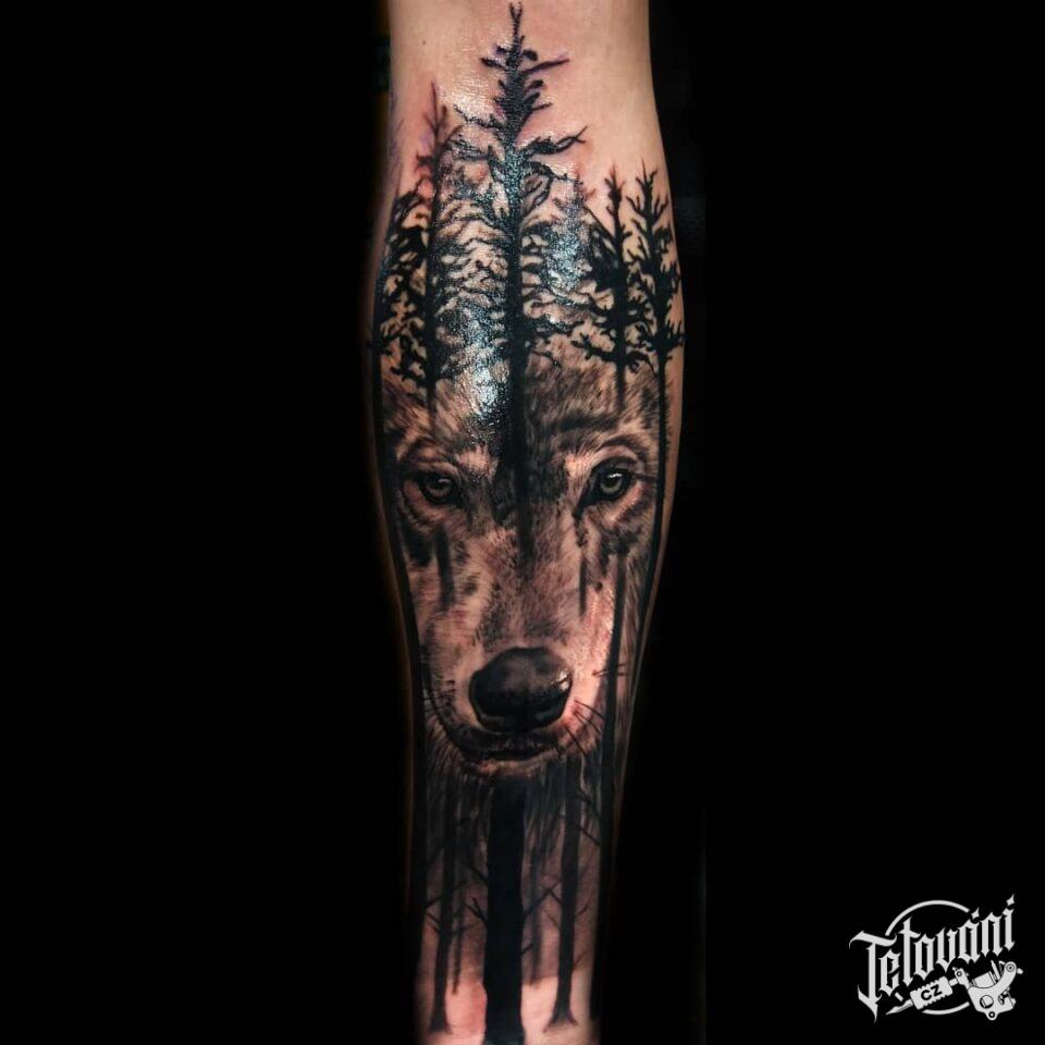 Tetování zvířata, vlk, les na předloktí