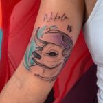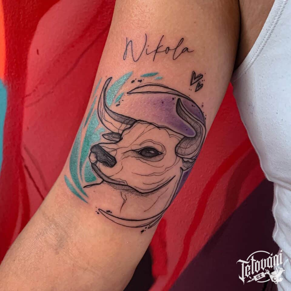 Tetování zvířata, znamení zvěrokruhu, býk a jméno na paži