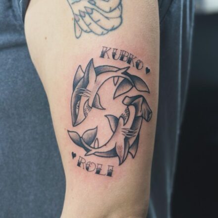 Tetování zvířata, žraloci a znaky a symboly na předloktí