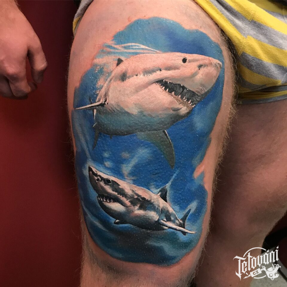 Tetování zvířata žraloci na stehno