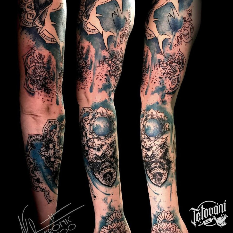 Tetování zvířata, žralok, ryba, ornamenty, rukáv
