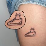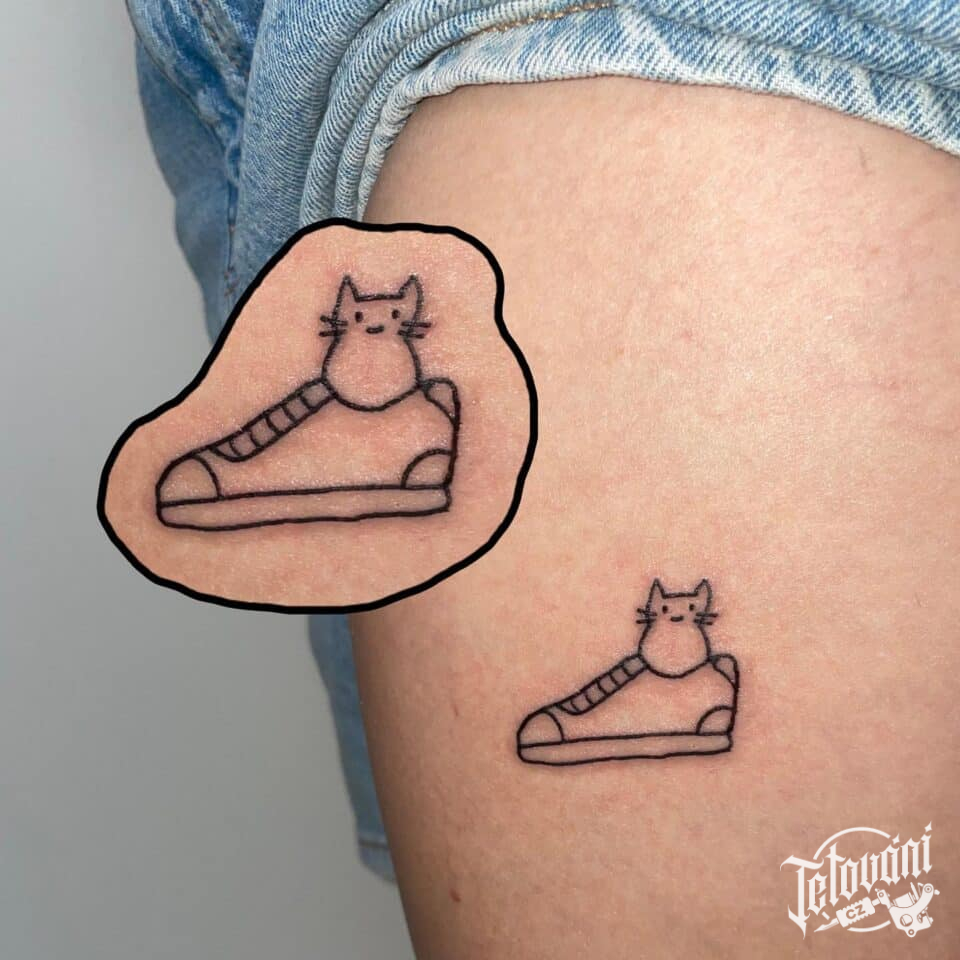 Tetování zvířátko, kočka v botě na boku stehna