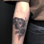 Tetování zvíře a květina, pes a slunečnice na předloktí