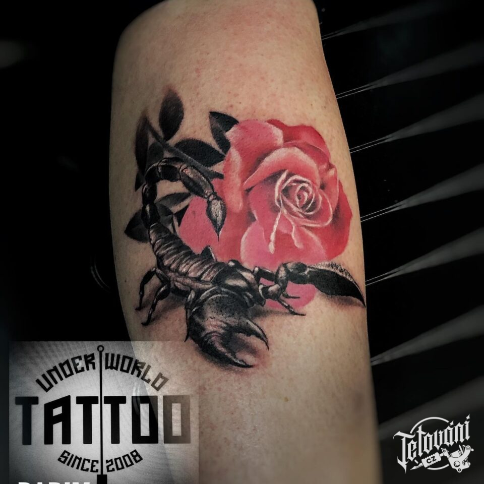 Tetování zvíře a květina, škorpion, štír znamení zvěrokruhu a růže na lýtku