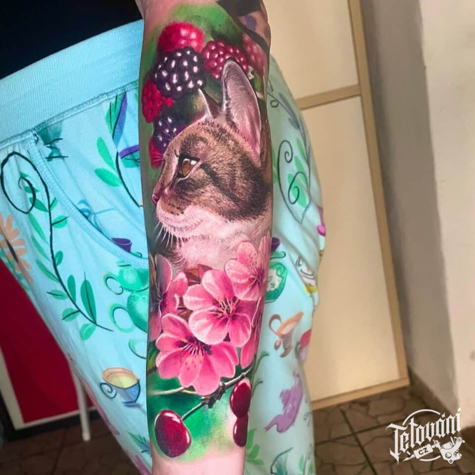 Tetování zvíře a květiny, kočka a sakury na předloktí