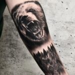 Tetování zvíře a příroda, medvěd a les na předloktí