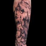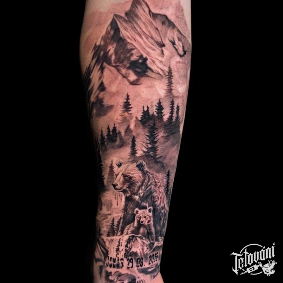 Tetování zvíře a příroda, medvědi a hory na předloktí