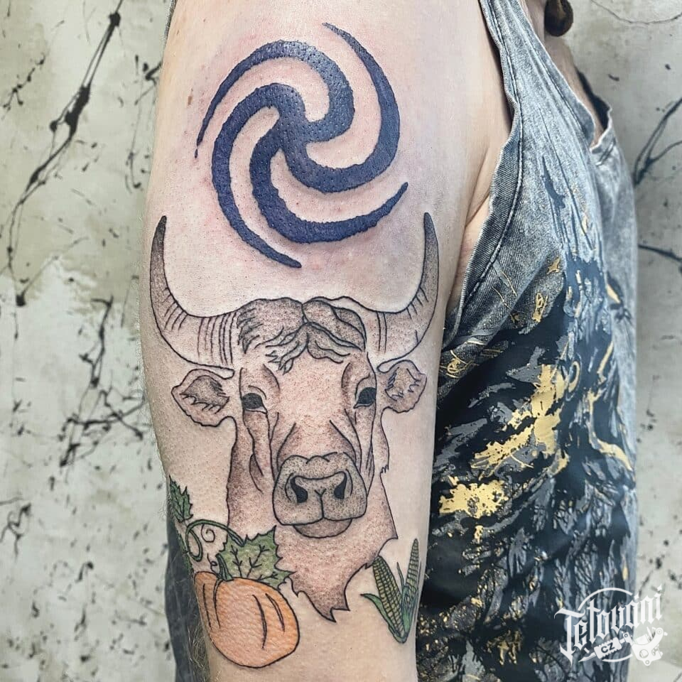 Tetování zvíře a znamení zvěrokruhu býk na rameno