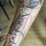 Tetování zvíře a znamení zvěrokruhu kozoroh, nápisy na předloktí