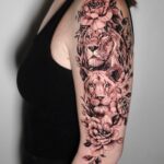 Tetování zvíře a znamení zvěrokruhu lev, květiny na rameno