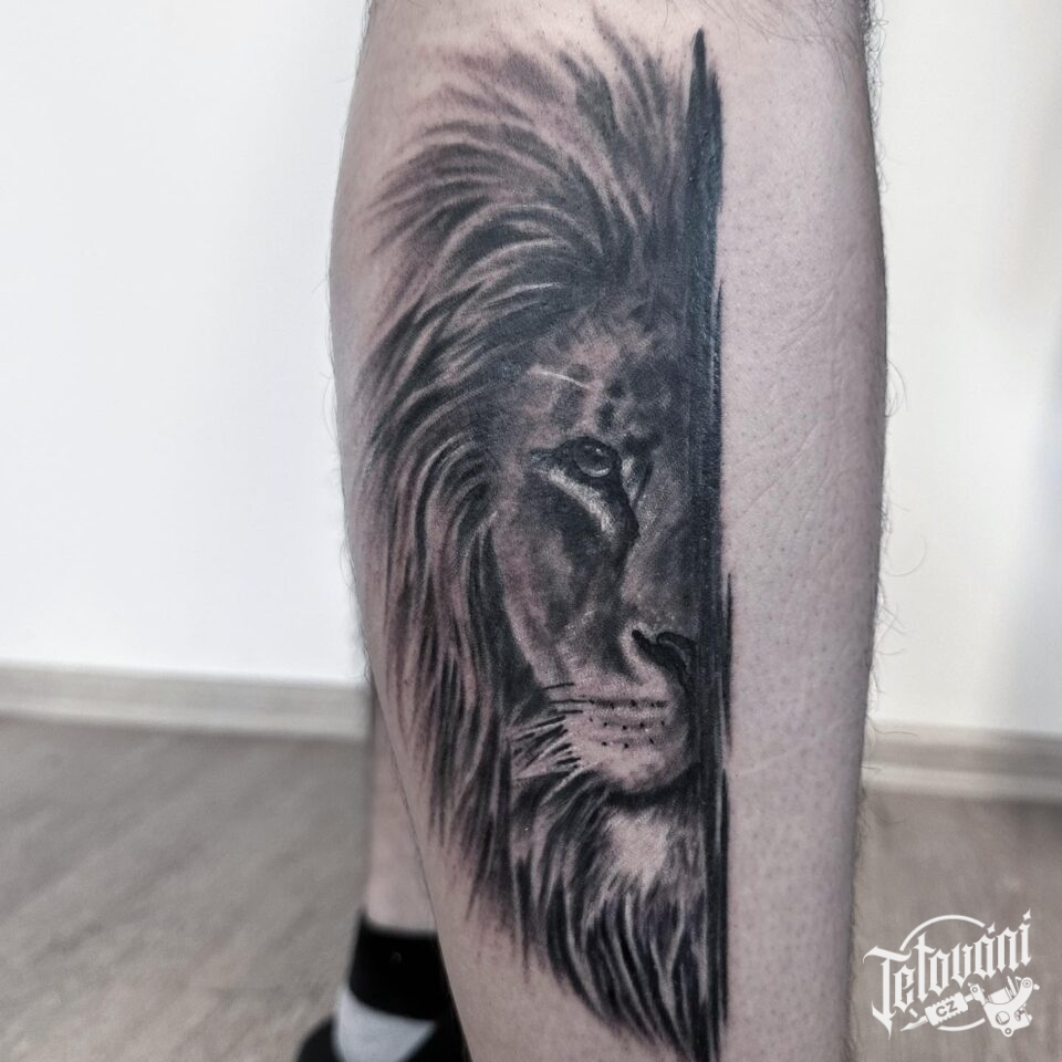 Tetování zvíře a znamení zvěrokruhu lev na lýtko