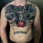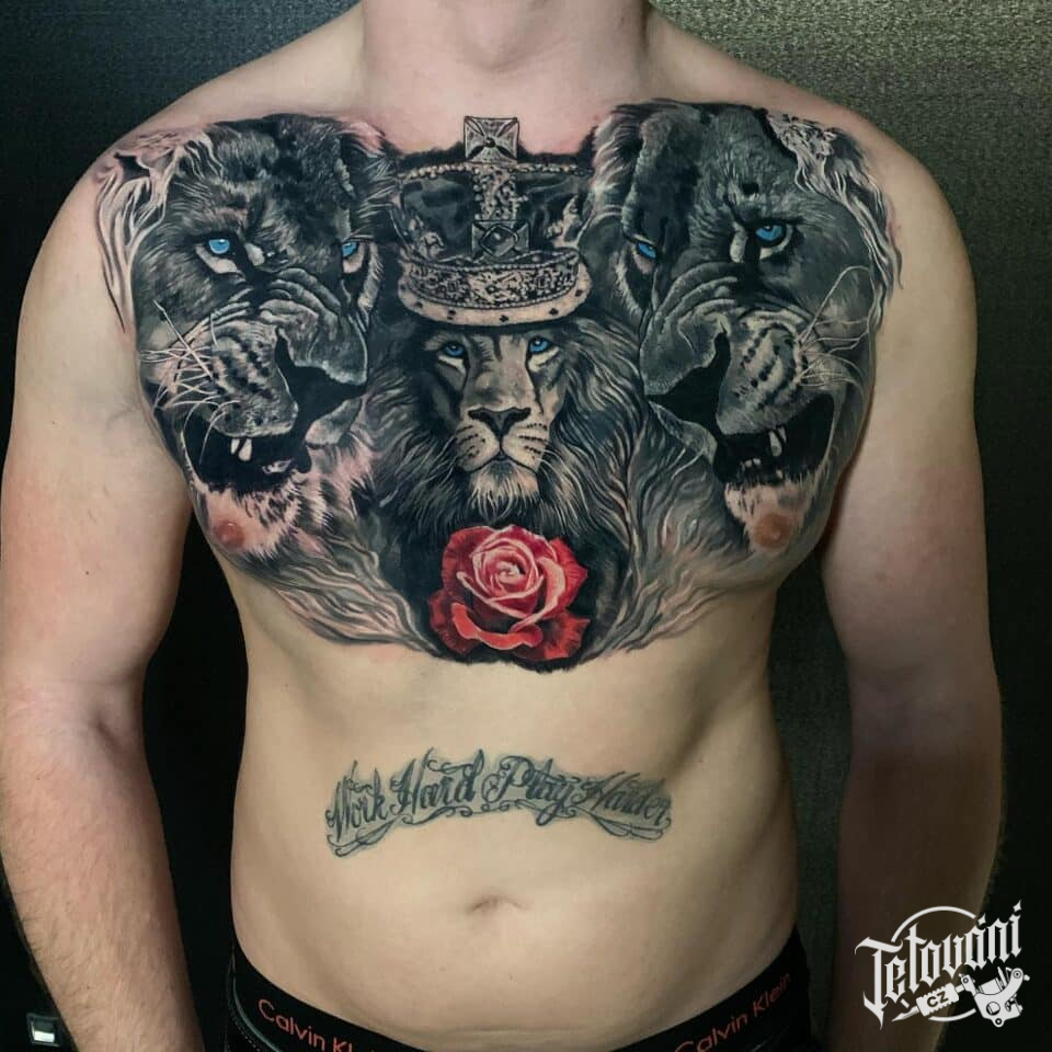 Tetování zvíře a znamení zvěrokruhu lev s růží, květiny na hrudník
