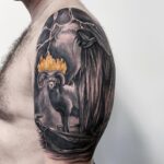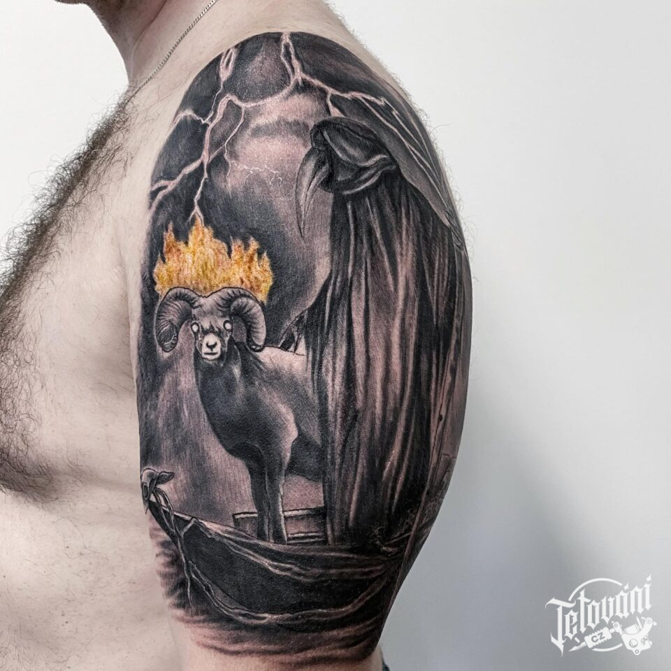 Tetování zvíře beran a Morový doktor na rameno