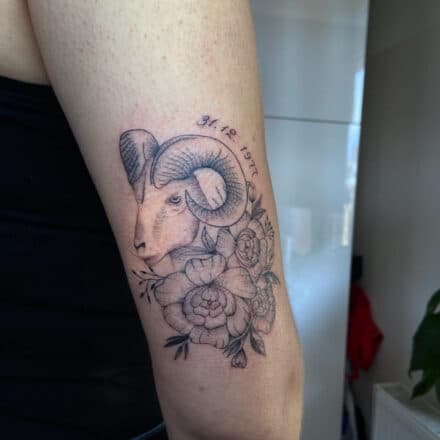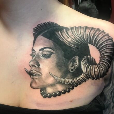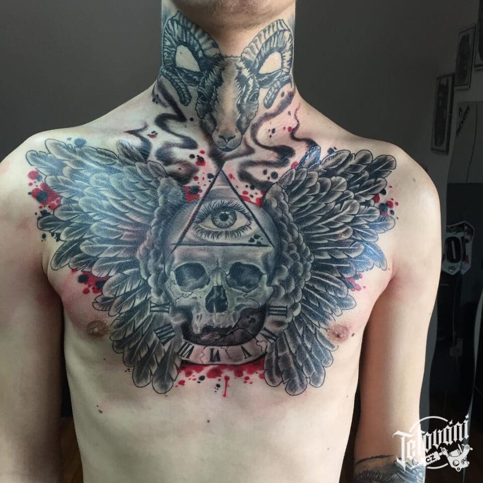 Tetování zvíře beran na krk a lebka s křídly a třetím okem na hrudník