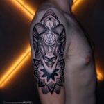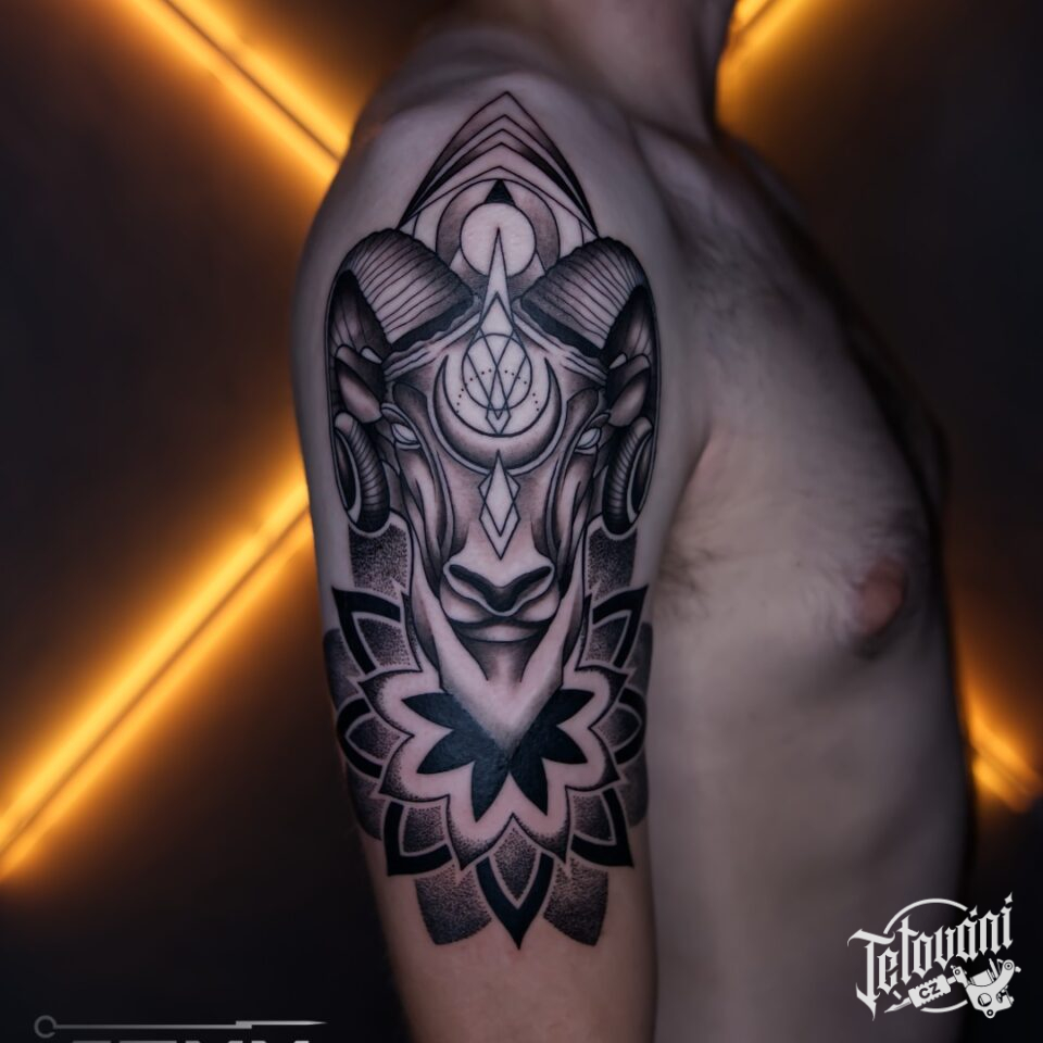Tetování zvíře, beran znamení zvěrokruhu a mandala na rameni