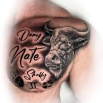 Tetování zvíře býk, symbol rodiny, jména, psí tlapka na prso