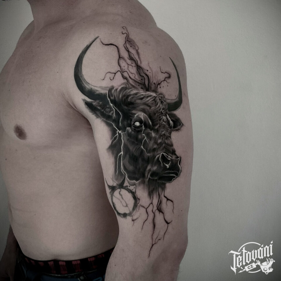 Tetování zvíře, býk znamení zvěrokruhu, hlava býka na rameni