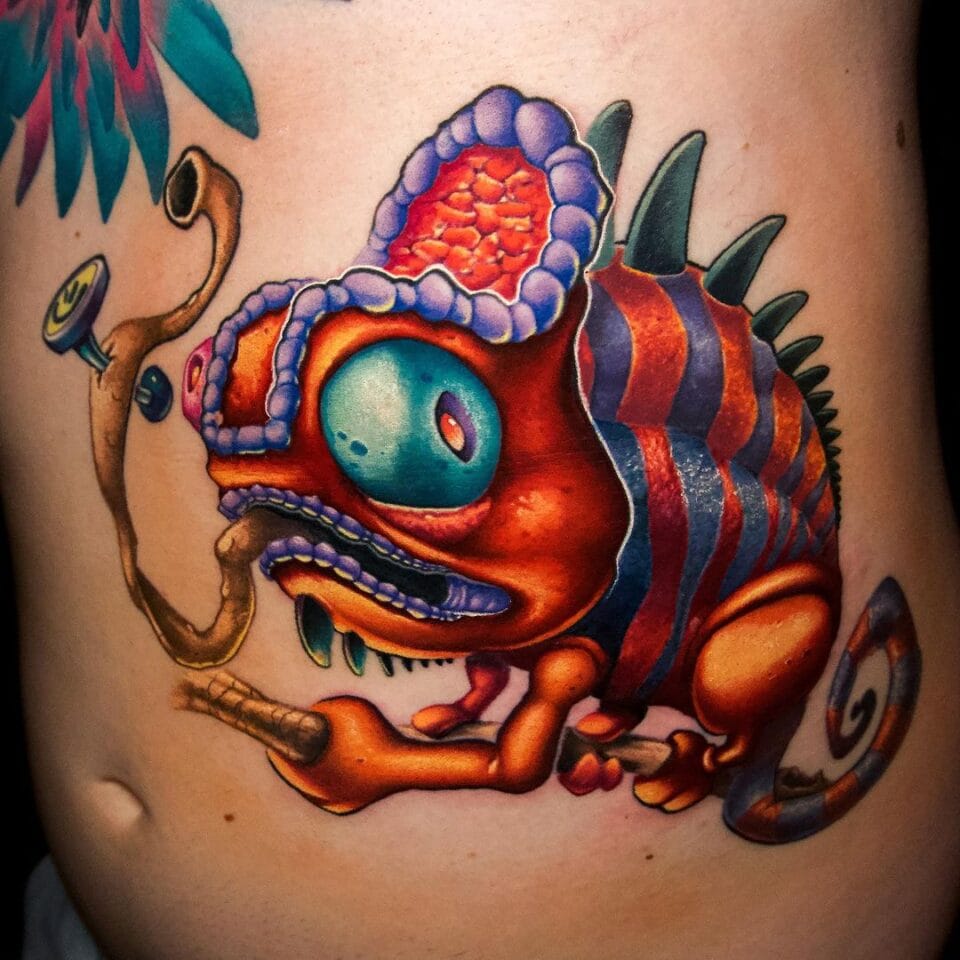 Tetování zvíře chameleon na větvičce na břiše