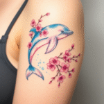 Tetování zvíře delfín, květiny sakury na rameni