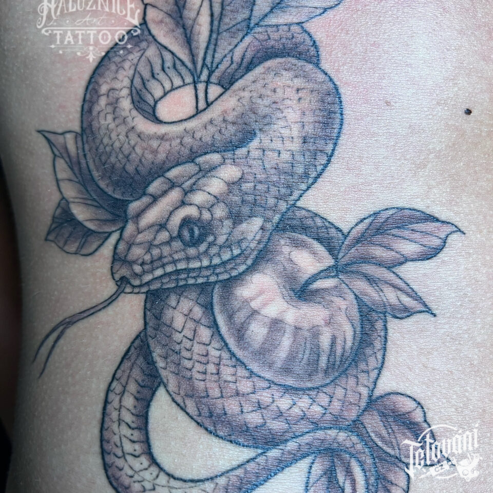 Tetování zvíře, had a jablko na boku