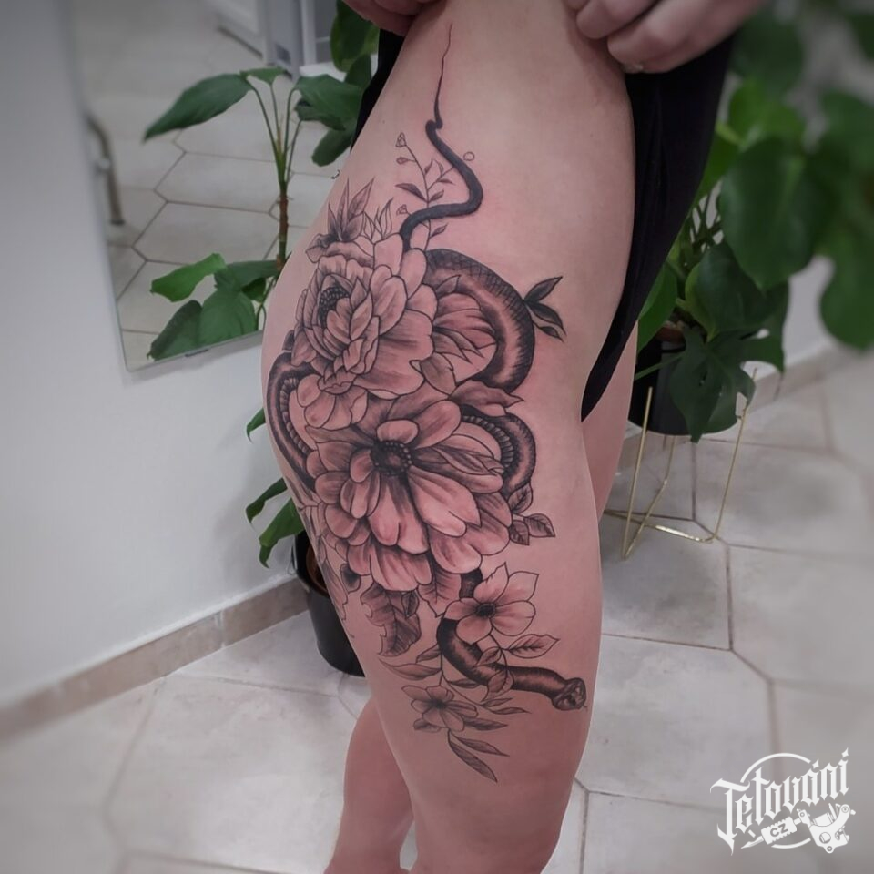 Tetování zvíře, had a květiny na boku stehna