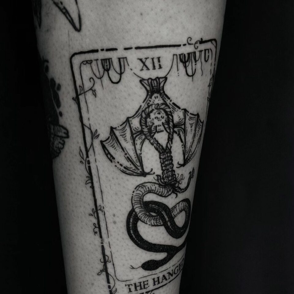 Tetování zvíře had a netopýr, karta, nápisy, písmena na holeň