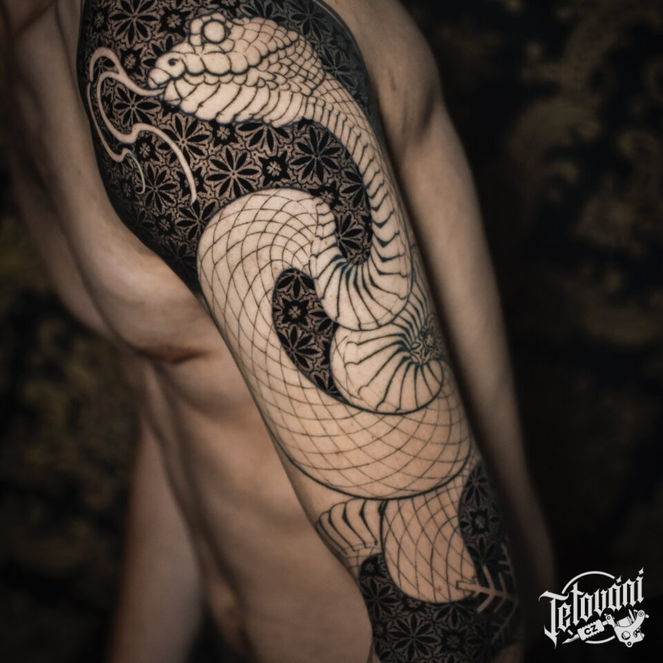 Tetování zvíře had a ornamenty na rameno