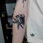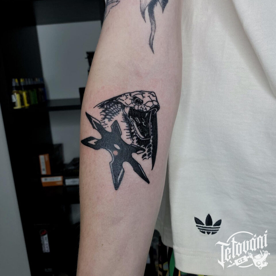 Tetování zvíře had kobra a předmět zbraň vrhací hvězdice, znak a symbol síly na předloktí
