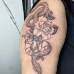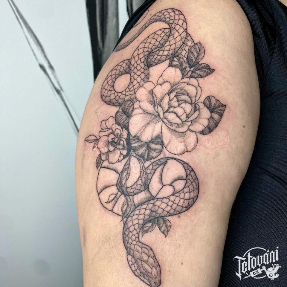 Tetování zvíře had, květiny na rameno