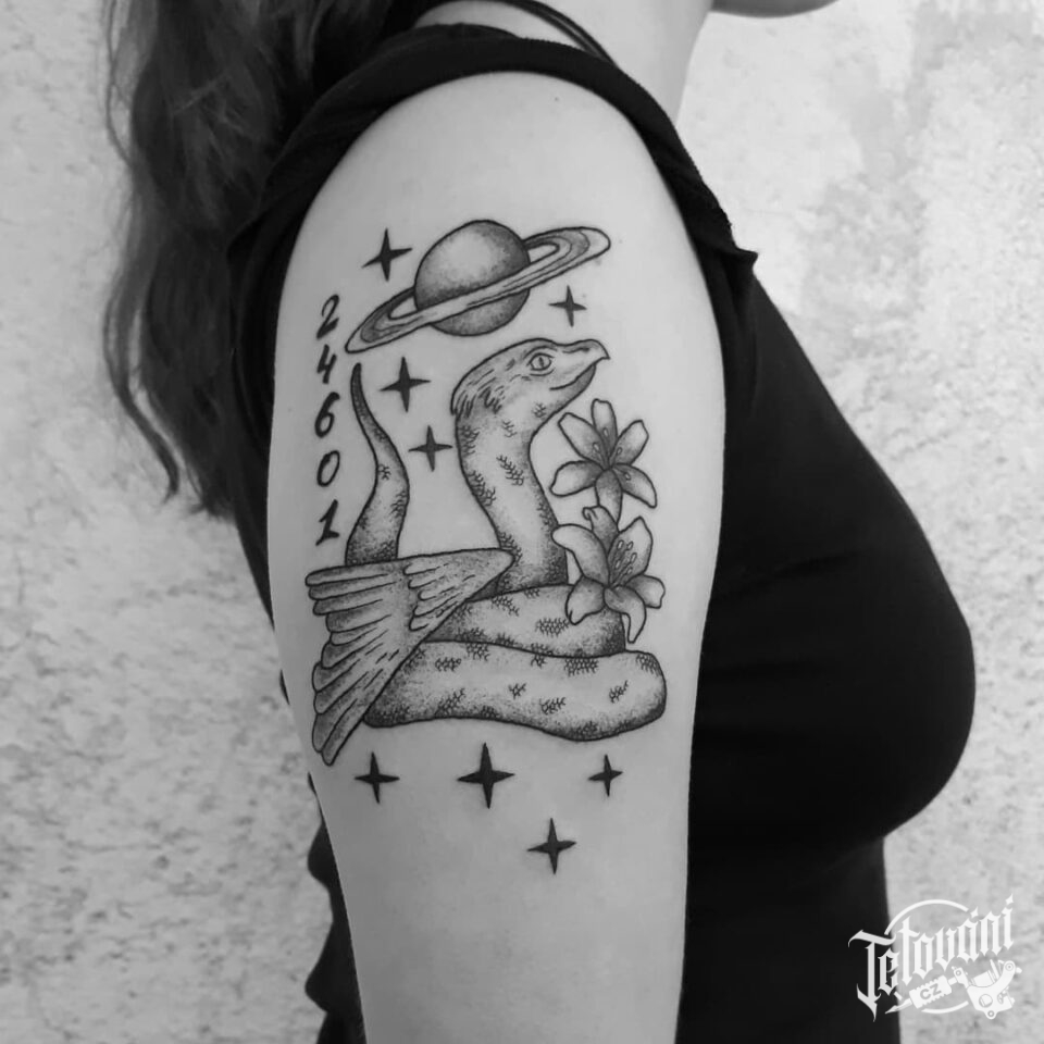 Tetování zvíře, had, planeta, hvězdy, květiny lilie na rameni