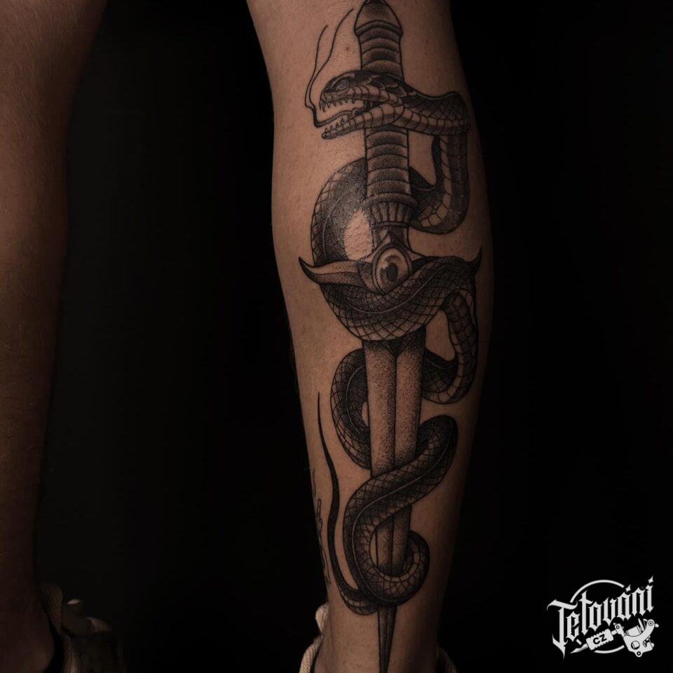 Tetování zvíře, had s mečem na lýtku