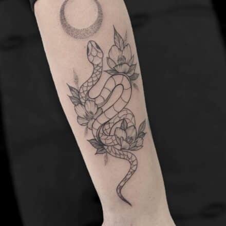Tetování zvíře, had s růžemi na předloktí