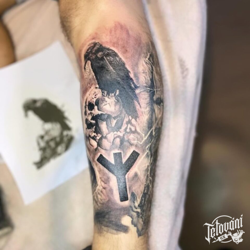 Tetování zvíře, havran a lebka, symbol na lýtku