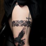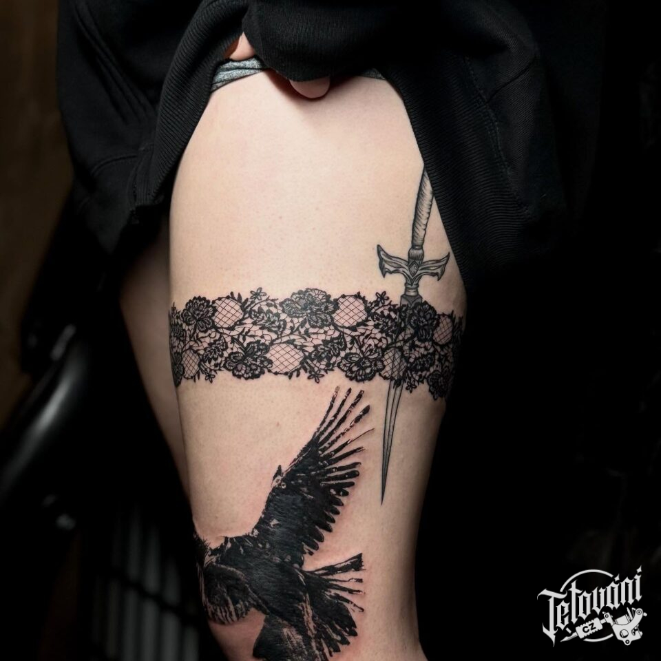 Tetování zvíře, havran, podvazek a meč na stehno