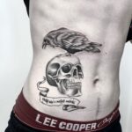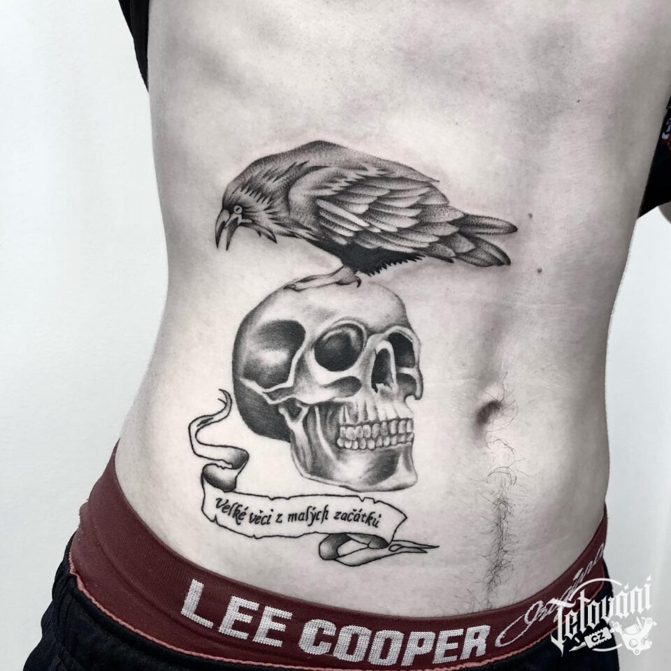 Tetování zvíře havran s lebkou na břicho