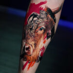 Tetování zvíře, hlava býka na lýtku