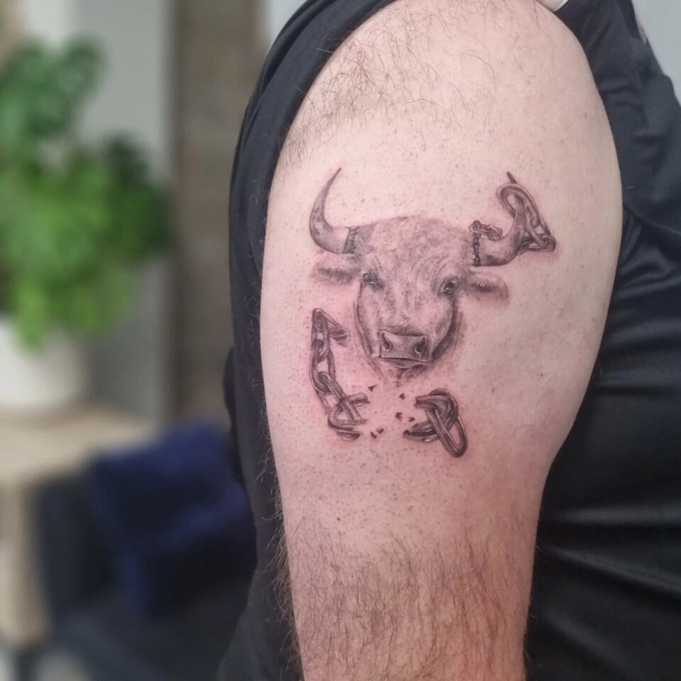 Tetování zvíře, hlava býka, znamení zvěrokruhu na rameni