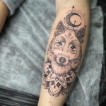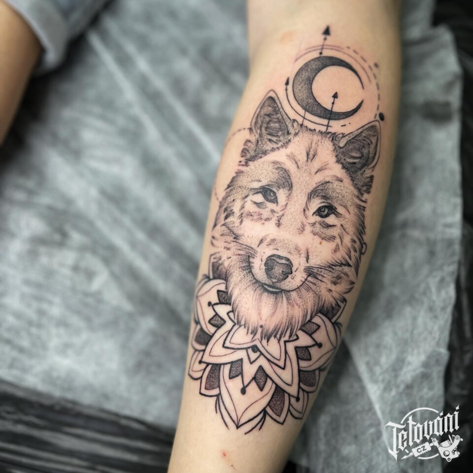 Tetování zvíře, hlava vlka a mandala štěstí s měsícemna předloktí