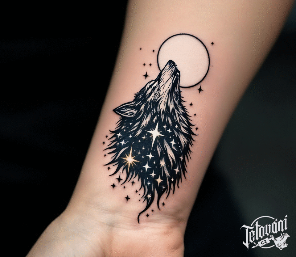 Tetování zvíře, hlava vlka a Měsíc na zápěstí