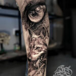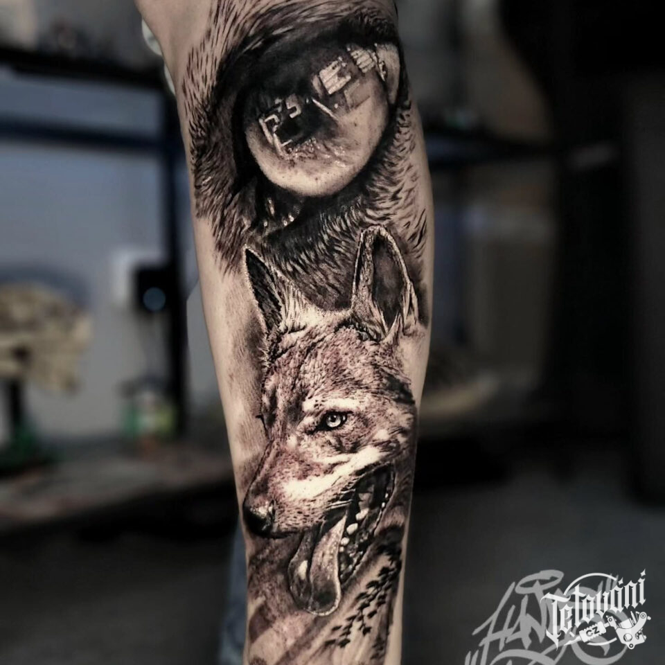 Tetování zvíře, hlava vlka a oko na lýtku