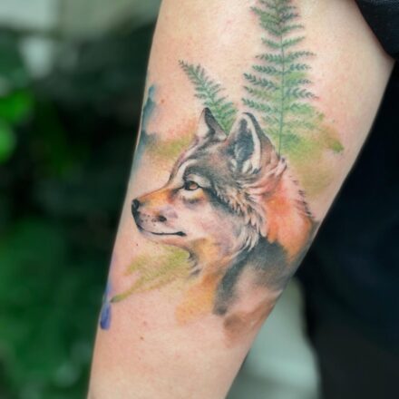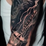 Tetování zvíře, hlava vlka a Thorovo kladivo na rameni