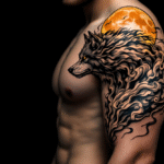 Tetování zvíře, hlava vlka a zlatý Měsíc na rameni